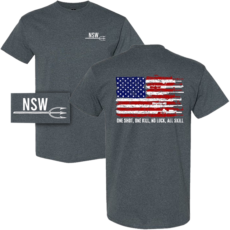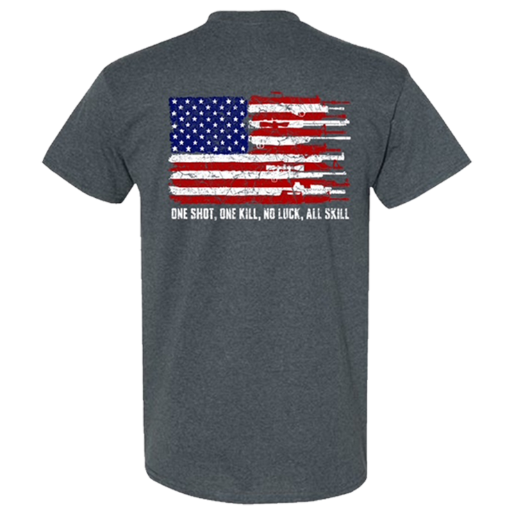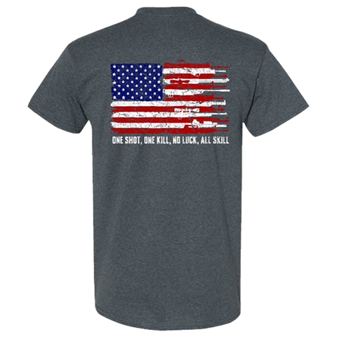 - Back Design: Red/White/Blue Distressed American Flag with Guns hidden in the Lines of the Flag; Underneath the Flag: ONE SHOT, ONE KILL, NO LUCK, ALL SKILL in White Lettering