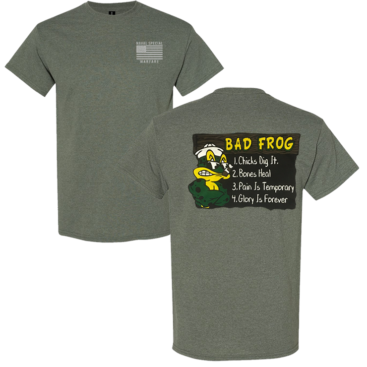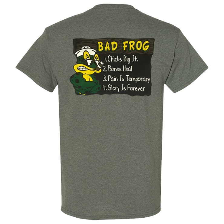 - Back Design: BAD FROG 1. Chicks Dig It 2. Bones Heal 3. Pain Is Temporary 4. Glory Is Forever with Freddy the Frog